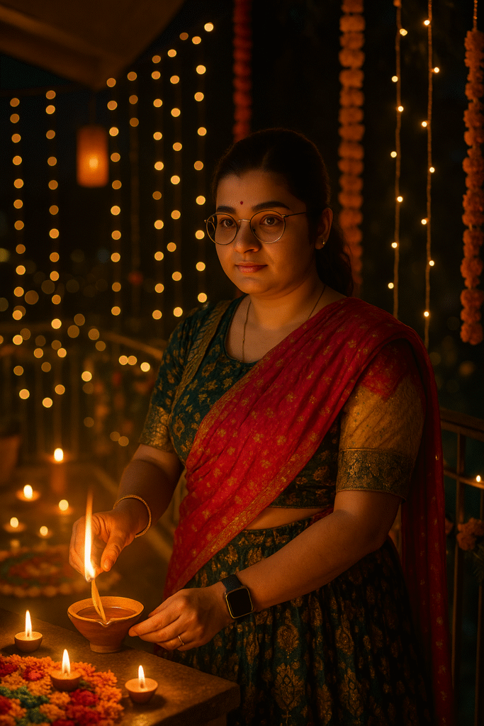 - “Ultra-HD portrait with diya reflection on face, festive smile, soft tone.”