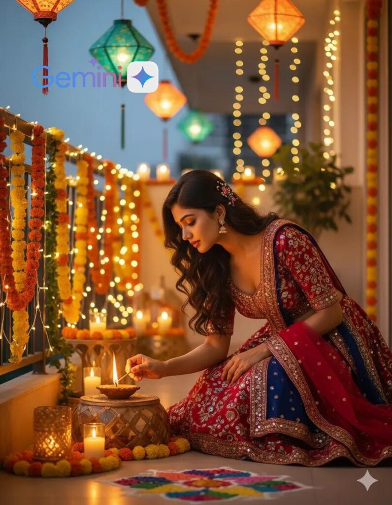 2.Girls copy Prompt ( Ultra realistic 4K HD Diwali festival scene, a beautiful young woman wearing a stylish traditional lehenga, gracefully lighting an earthen diya lamp. Her face must remain exactly the same as in the reference photo, no face change. Background is outdoor with a modern festive look – balcony or terrace decorated with fairy lights, lanterns, glowing candles, flower garlands, and elegant rangoli Warm golden cinematic lighting, natural skin tone, high quality, 100% matching my face)