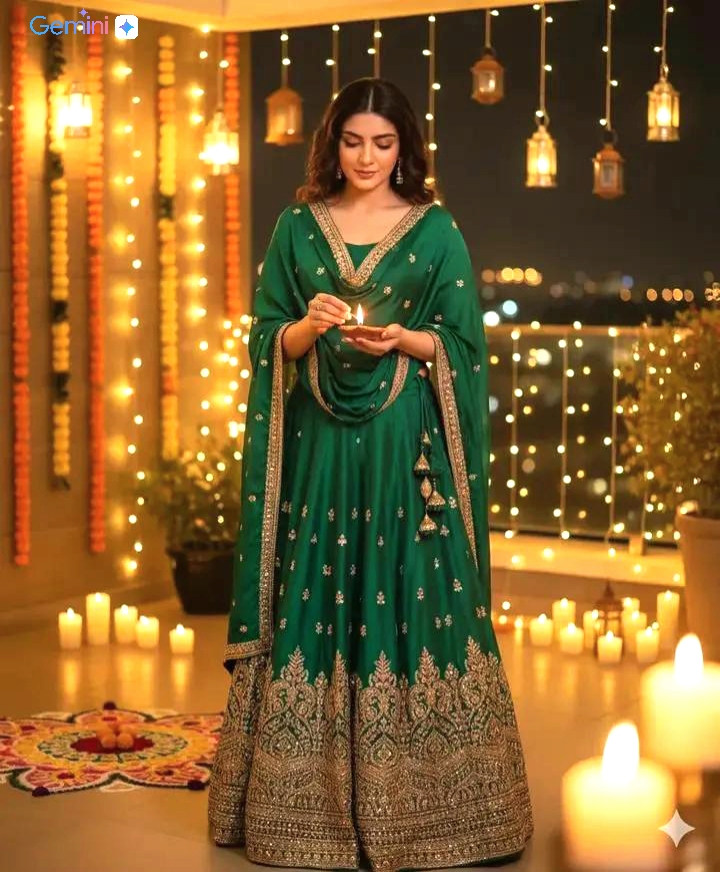 “Woman wearing royal lehenga and jewelry, warm diya lights around, ultra-HD portrait style.” - Modern Festive Glam