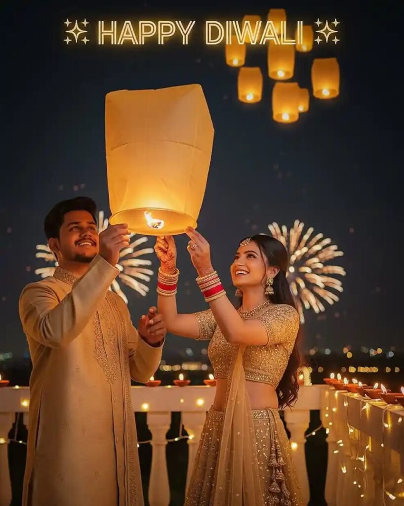 4.Couple CopyPrompt (Ultra-realistic 8K hyper-detailed vibrant Diwali couple portrait from a different camera angle. Beautifully decorated Indian terrace, fairy lights, glowing diyas, soft DSLR-style blurred background with distant fireworks (cinematic bokeh). Sky lanterns flying in the background. Boy (20, South Asian, slim fit) in royal golden embroidered kurta. Face matches reference image, festive smile. Girl in matching golden lehenga with shimmering embroidery, festive hairstyle, traditional jewelry. Both holding a sky lantern together, looking up with happy expressions. Golden glow from diyas, sparkling highlights, dreamy cinematic tones. Text overlay:)